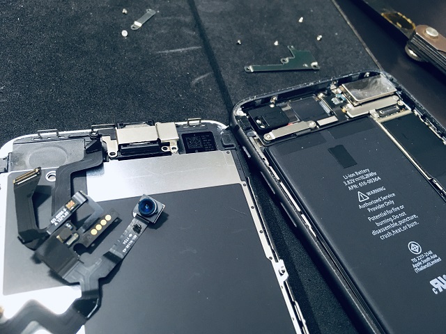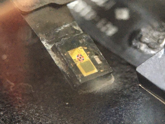 乾いてはいますが上部に水濡れの痕跡があり、これが災いしてパーツの破損につながっています。不具合を起こしているパーツは、近接センサ付きインカメラです。センサのチップ部品周辺の半田が解けて焦げ始めていました。