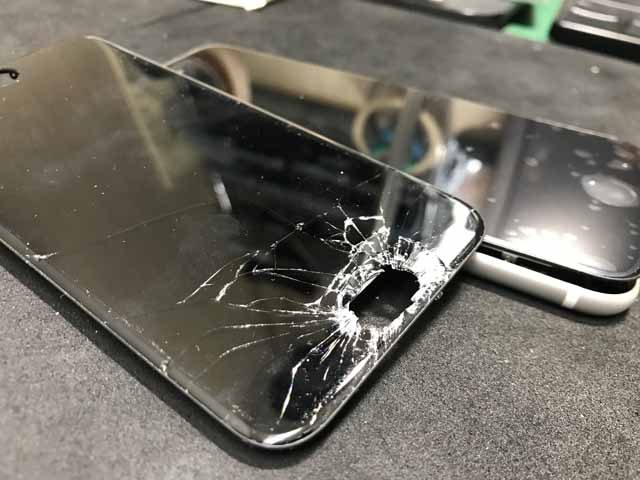 落下させたときに、ちょうどイヤスピーカの部分に固いものが当たったようで、ガラスが割れ穴が開き始めてしまい、液晶部分まで広がっている状態です。TrueToneのデータの書き込みも含めて修理させて頂きました。