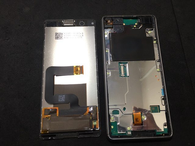 Xperia Ace SO-02Lの分解は、まず、表側の液晶パネルの剥離から進めます。裏面(バックパネル)ではありません。液晶パネルはビスは使われていませんが、粘着テープにて本体フレームと液晶パネルが接着されているので液晶を損傷させないように注意が必要です。