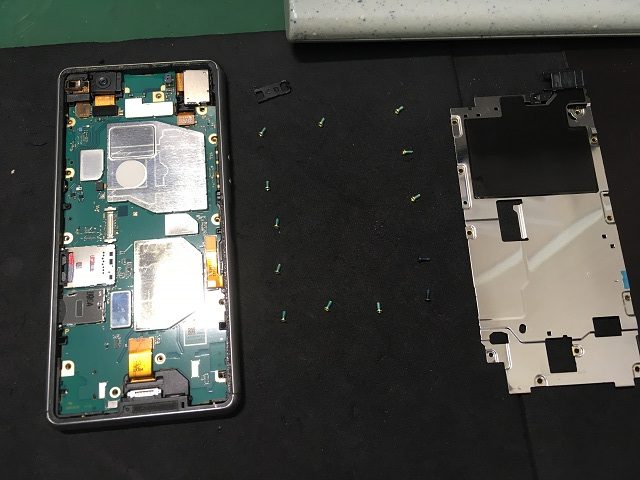 液晶パネルが外せたら次は、10本ほどのネジを外しシールド板を取り出します。シールド版を外すと基板が見えてきます。この基板の裏側に目的のバッテリーが取り付けられています。